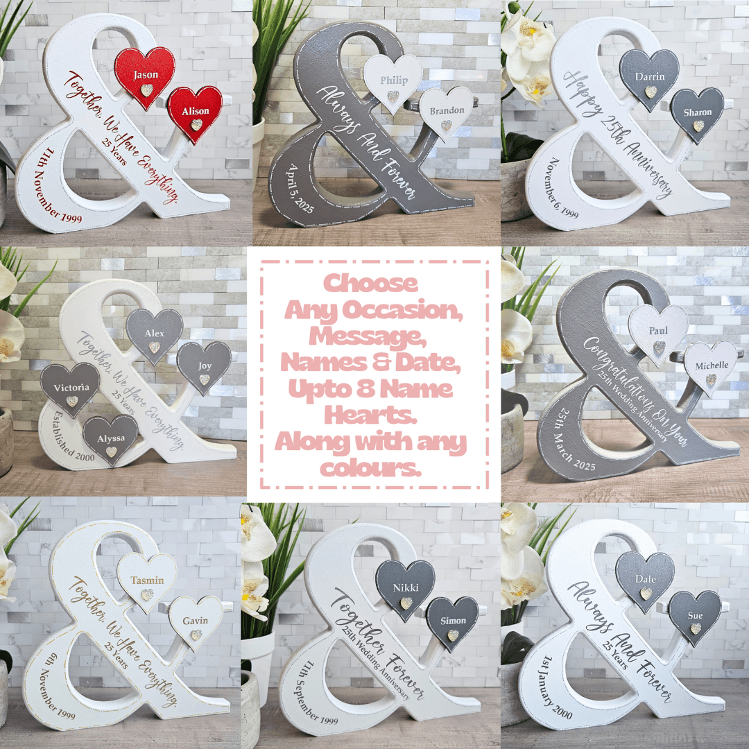 •The Ampersand is 20cms (8 inches) tall and 18mm (0.7 inches) thick, hand painted MDF wood. The ‘stitching’ detail around the edges of the & Sign and hearts, is added by hand, and can be in white, silver or gold.