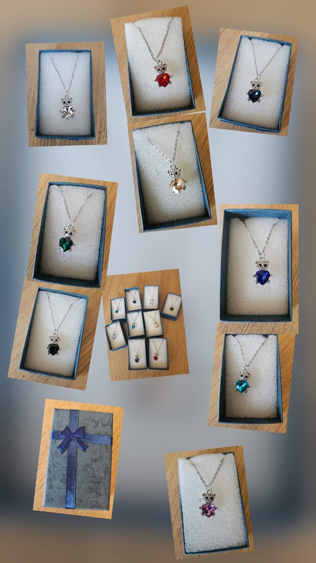 Bring a touch of cuteness and love to your outfit with our adorable bear hugging a heart gemstone necklace. This charming necklace comes in a gift box and is available in three color options: black, blue, or red.