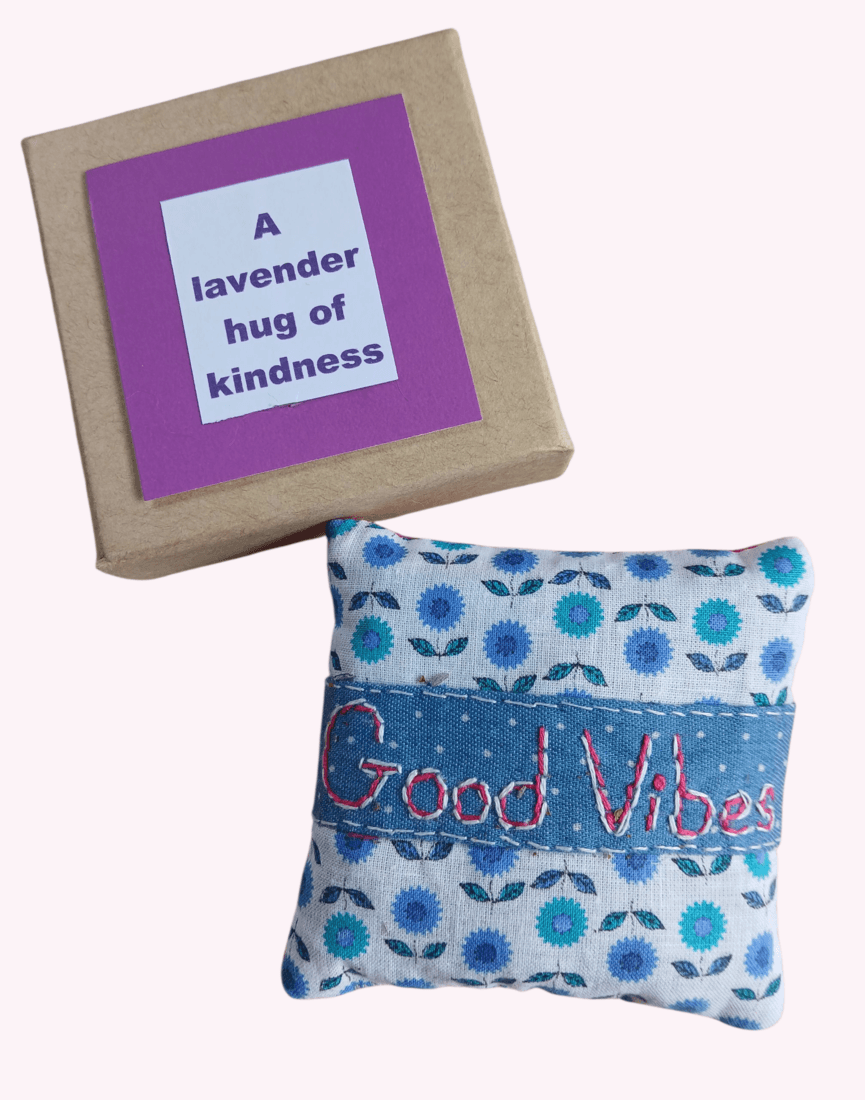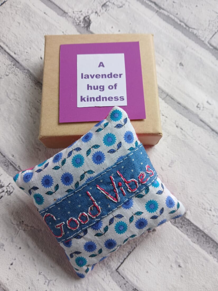 A beautiful hand embroidered ‘pocket hug’ in a box. It measures approximately 3.5x 3.5 inches.Place in your pocket and squeeze to release the aroma of homegrown lavender. The felt and cotton lavender sachet comes in a gift box for £10