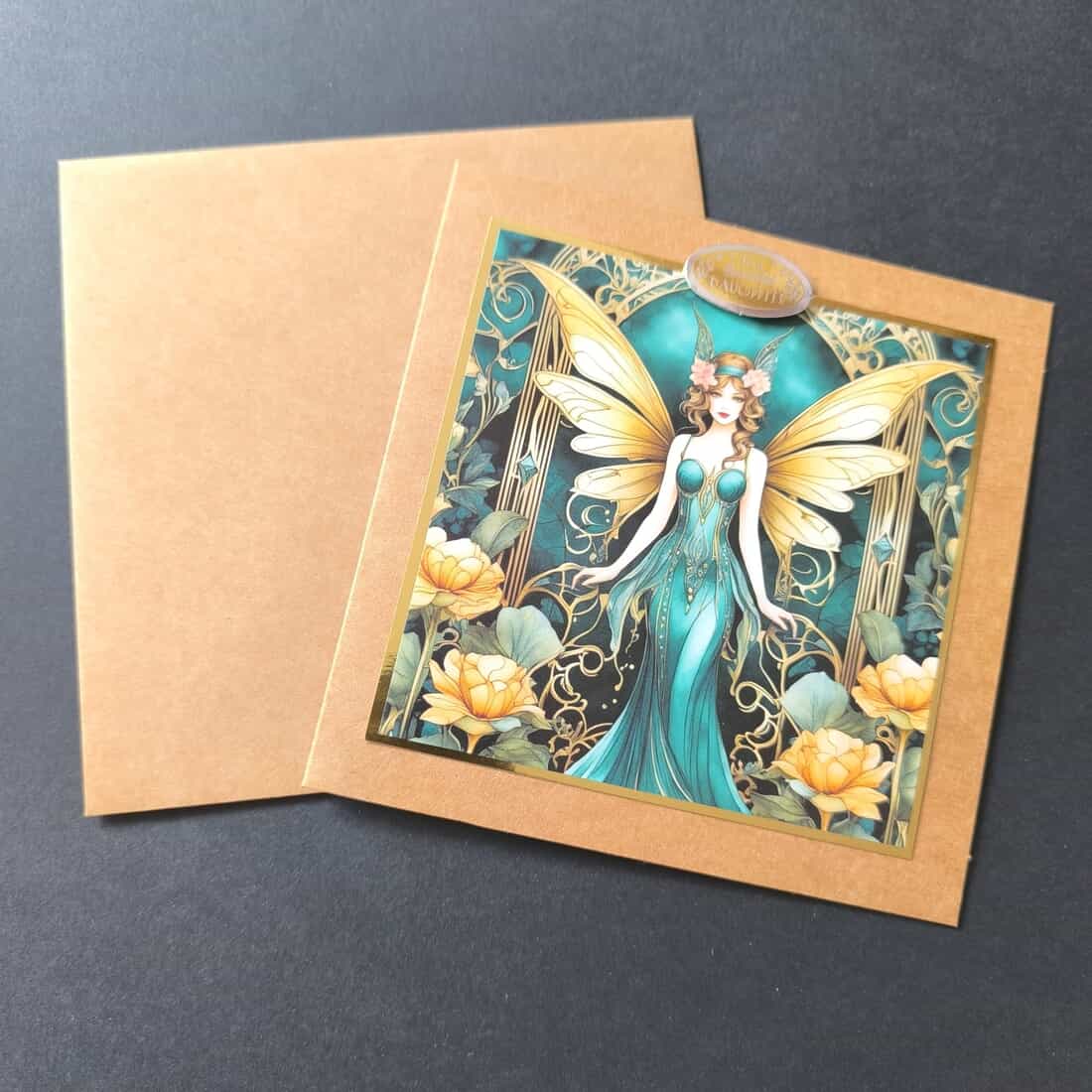 Celebrate your daughter’s birthday with this exquisite Art Deco style flower fairy card. Crafted with die-cut sentiment and made from kraft card, it comes with a matching envelope.