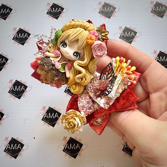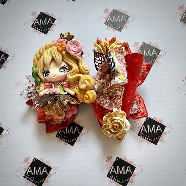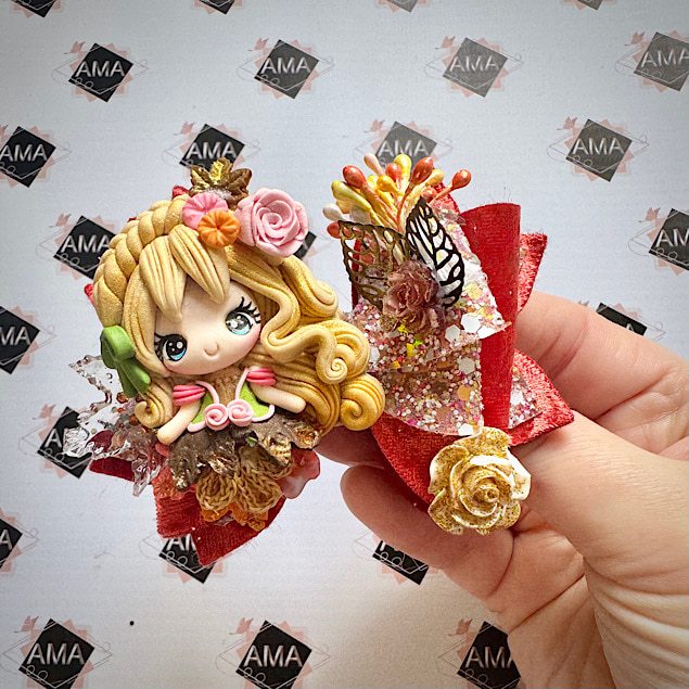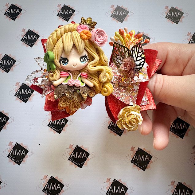 Add a touch of magic to your little girl’s look with this stunning autumn fairy hair bow. Featuring a mix of orange and golden glitter, this velvet hair clip is adorned with a charming fall fairy, complete with clay leaves and a pink floral detail. The bow is elegantly embellished with golden filigree leaves, stamens, and floral decorations, making it a perfect gift for any young girl.