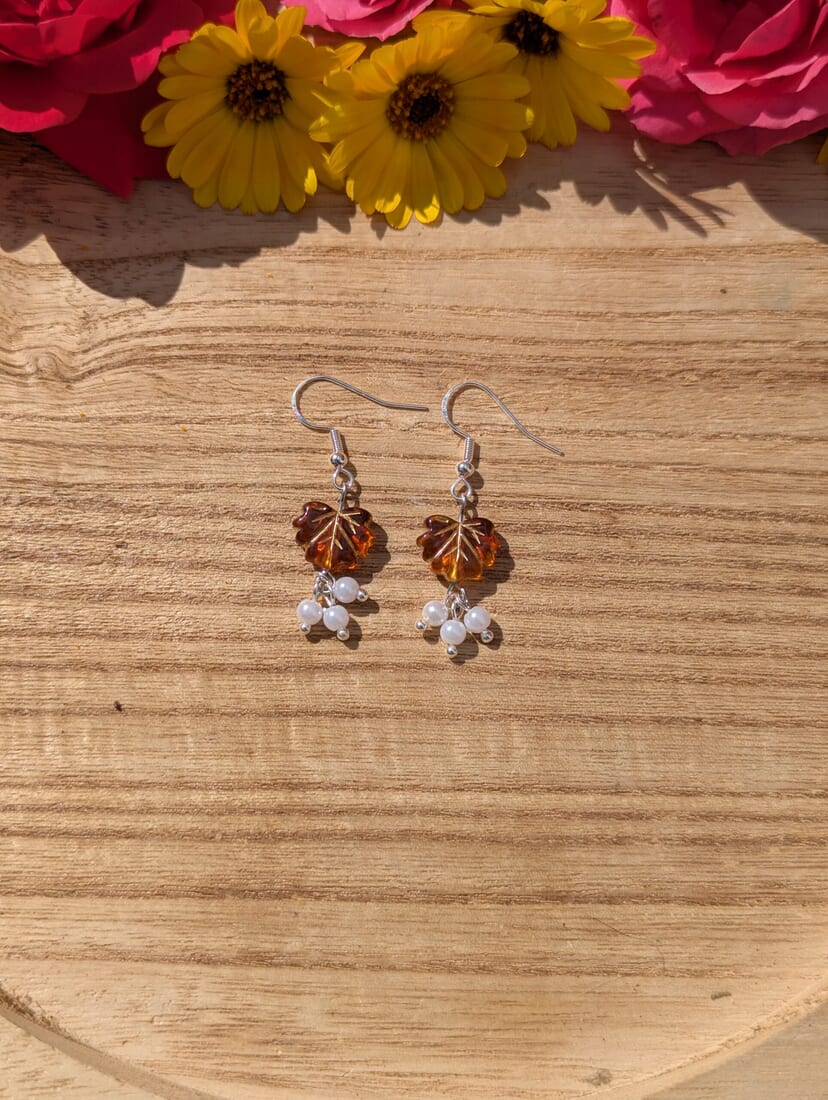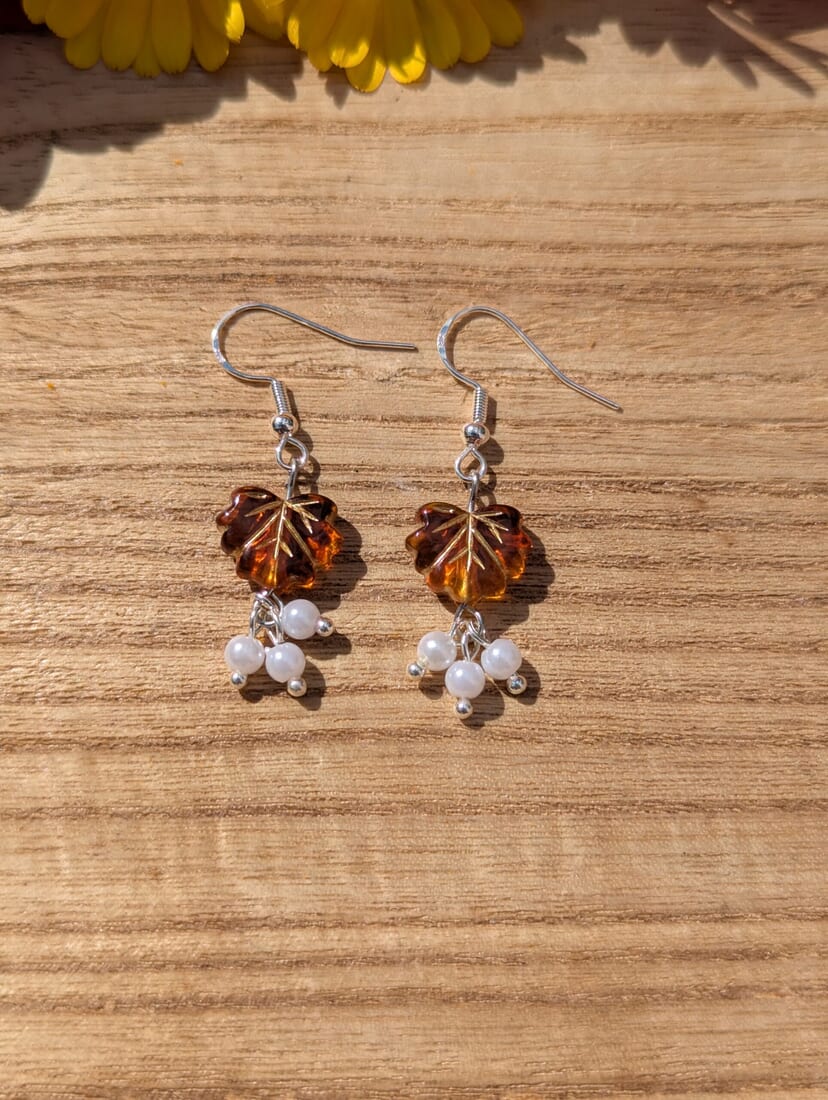 Autumn Leaf Earrings with White Beads – Handcrafted Jewelry
