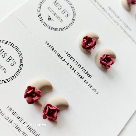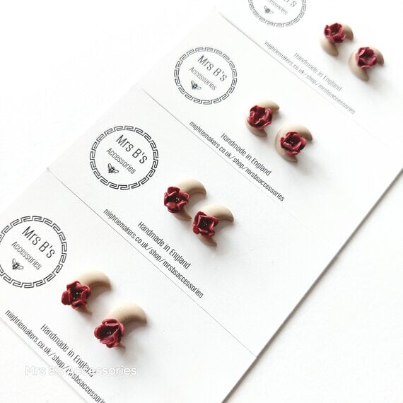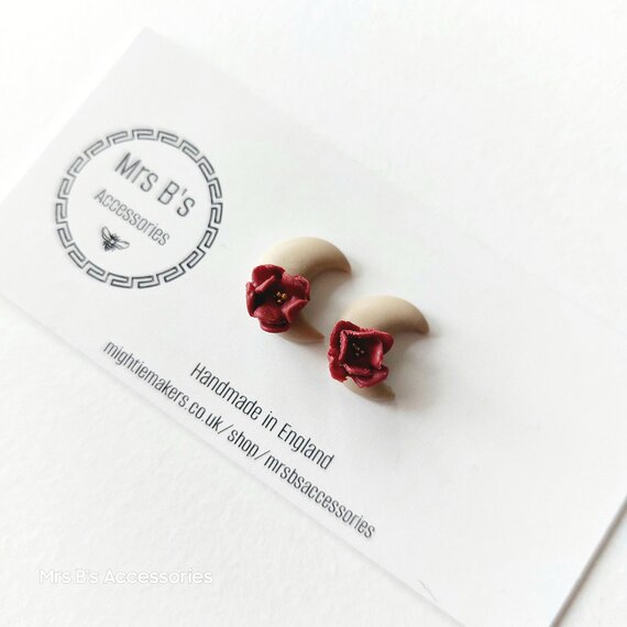 Explore the beauty of autumn with these unique handmade polymer clay earrings. Crafted in small batches, each earring features a stunning milky moon and intricate wine & gold flower design. The earrings are adorned with titanium posts for a comfortable and hypoallergenic wear.