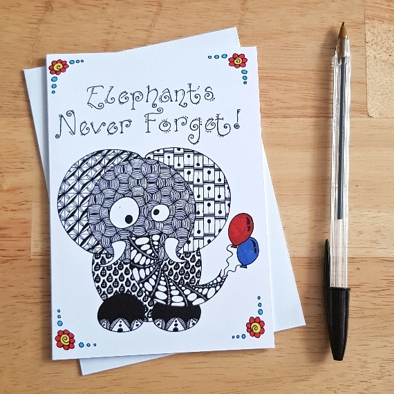 Belated Birthday Card – Elephants Never Forget – Hand-Drawn Doodle Elephant Design – Fun And Quirky Greeting – Blank Inside