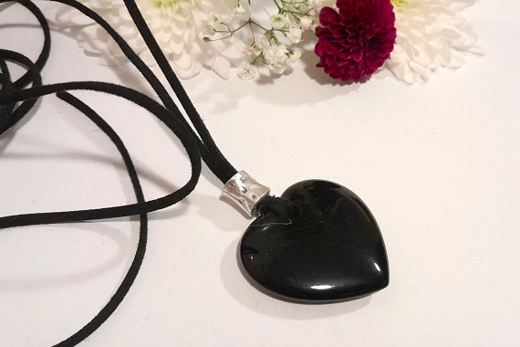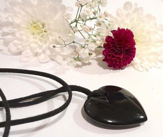 Black Agate Heart Necklace on Faux Suede Cord with Titanium Accent