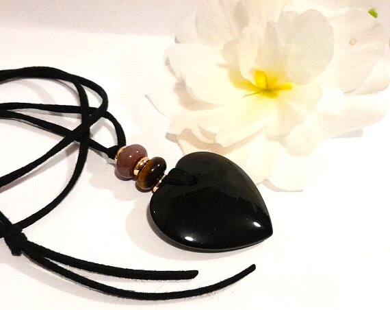 Adorn yourself with this stunning Black Agate Heart Pendant featuring Indian Agate and Tiger’s Eye beads. The 18k gold plated spacer beads add a touch of luxury to this piece, which is elegantly strung on a black self-tie faux suede cord. Heart size approx 40cm. See my other subtle design options.