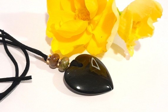 Discover a stunning Black Agate Heart Pendant adorned with Indian Agate Rondelle Beads and 18k Gold Plated Spacers. This elegant piece is set on a black self-tie faux suede cord, adding a touch of sophistication to your look. See my other design options.