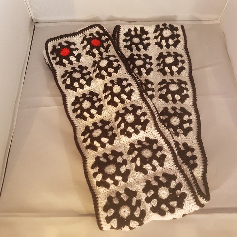 This lovely monochrome scarf is the perfect accessory to keep you warm on cold days. Handcrafted using 100% acrylic double knitting yarn, this scarf features a unique design with a combination of black, white, and red granny squares.