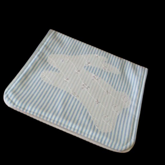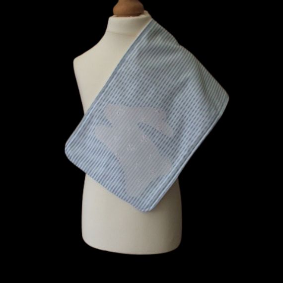 Keep your baby clean and stylish with this adorable blue and white striped burp cloth featuring a charming broderie anglaise rabbit applique. Made from 100% cotton fabric with a soft fleece backing, this burp cloth is a must-have accessory for any new parent.