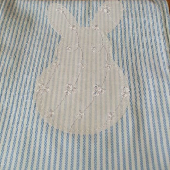 The fabric has a blue and white striped background with a rabbit applique cut from white broderie anglaise fabric.