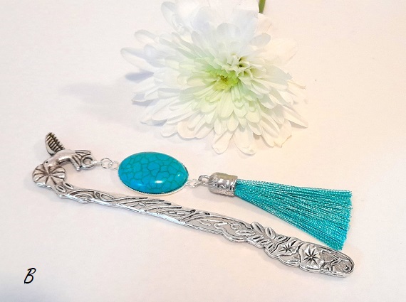 The intricate silver design adds a touch of sophistication, while the vibrant oval shaped turquoise charm and tassel bring a pop of color and style. Whether you’re a student, a bookworm, or simply enjoy reading, this bookmark is a perfect blend of functionality and aesthetics.
