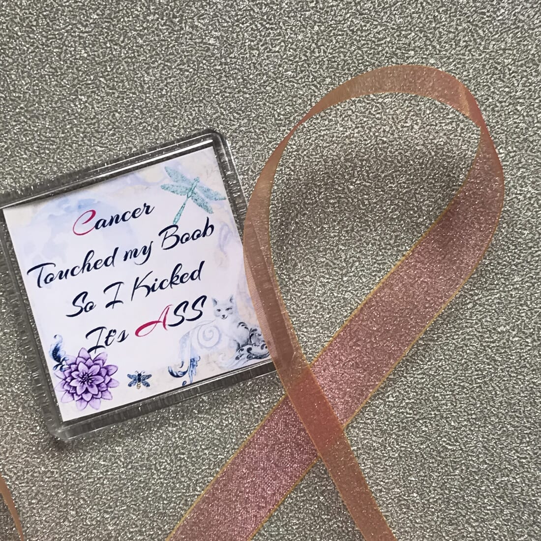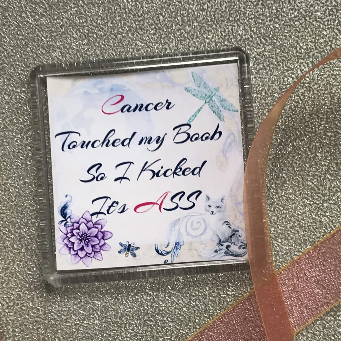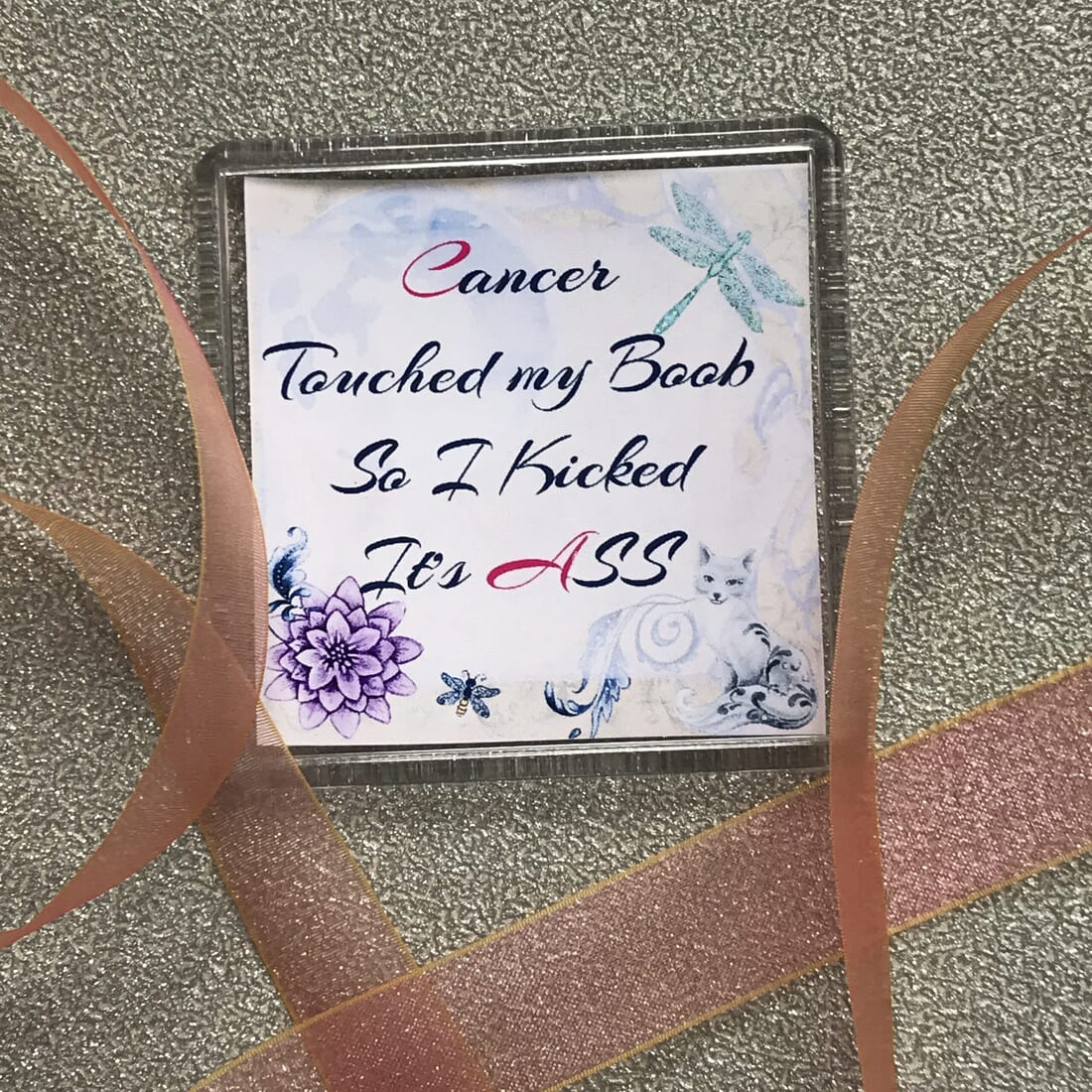 Spread positivity and encouragement to cancer patients with this quote: ‘Cancer touched my Boob so I kicked its Ass.’ on a 6cm x 6cm plastic fridge magnet. Here’s why this magnet is a great choice: