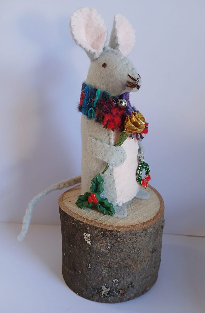 Add a touch of whimsy to your Christmas decor with this charming hand-sewn felt mouse wearing a red tartan scarf and holding a Christmas wreath and gold rose. Measuring approximately 7 inches in total, this mouse is mounted on a wooden block.