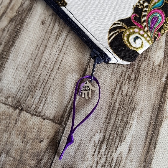 This medium-sized handmade pouch is ideal for keeping your makeup, stationery, or travel items tidy. It’s finished with a sturdy navy zipper, a purple ribbon pull, and a silver “handmade” charm, combining style and craftsmanship with everyday practicality.