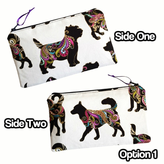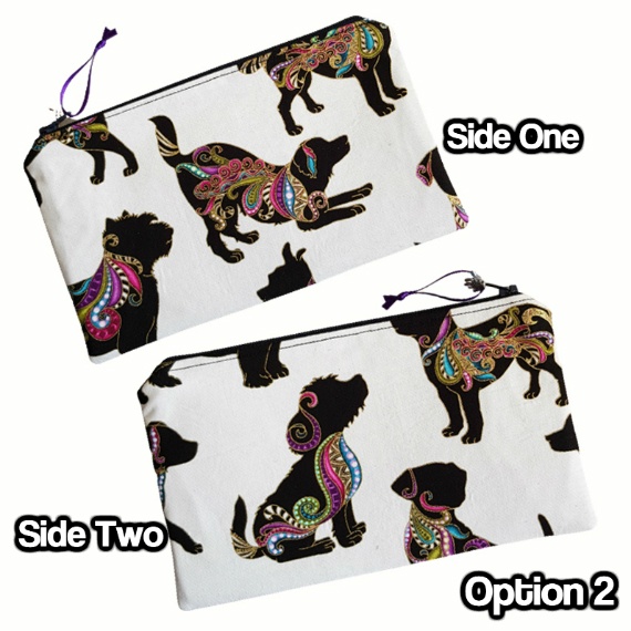 Show off your love for dogs and bold design with this colourful dog-themed zipper pouch! Featuring playful black dog silhouettes with bright, paisley-style accents on a clean white background, this pouch is a fun and eye-catching accessory. The inner lining features a richly patterned fabric in jewel tones, adding even more flair and surprise inside.