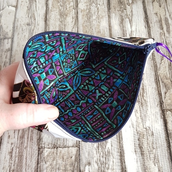 Materials: Cotton outer, vibrant printed lining, zipper closure