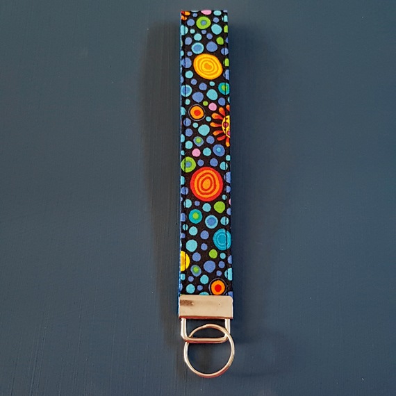 Bring joy and colour to your daily essentials with this colourful spots print wristlet keyfob. Featuring a lively mix of bright polka dots and bold circular designs on a dark background, this handmade accessory is both practical and eye-catching.