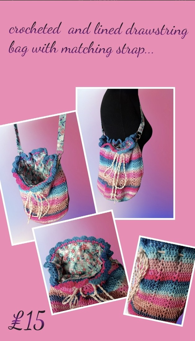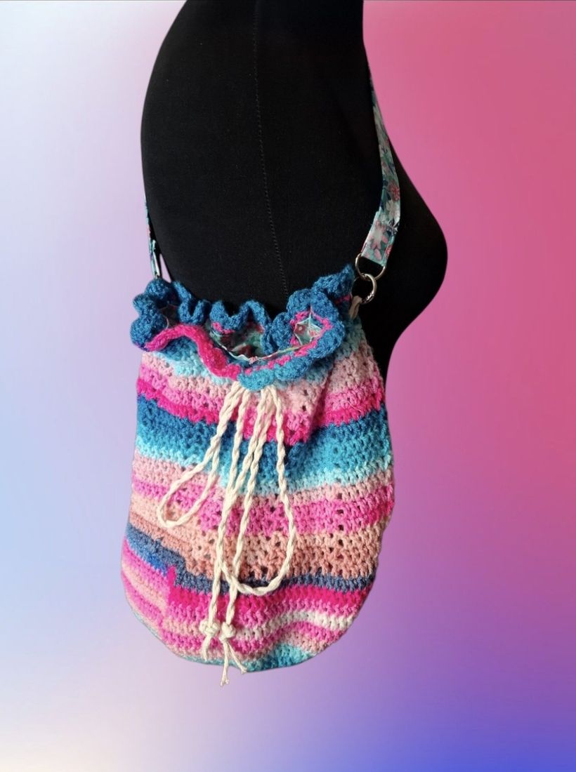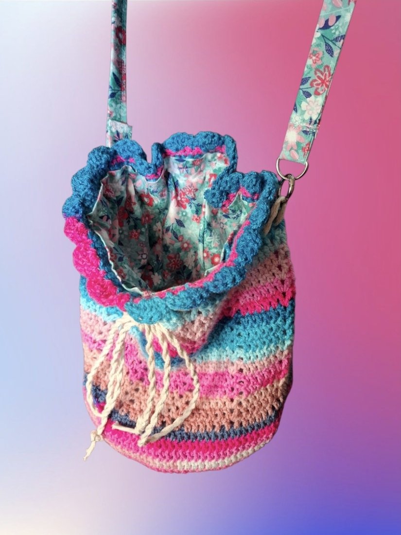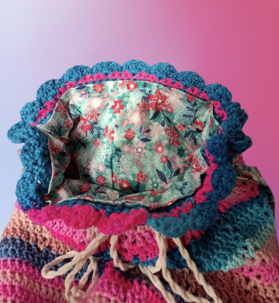 Shop this beautifully lined drawstring bag, hand-crocheted by me in support of my charity M.A.D. Perfect for cancer support gifts, Christmas in August surprises, or as a thoughtful accessory for any occasion.