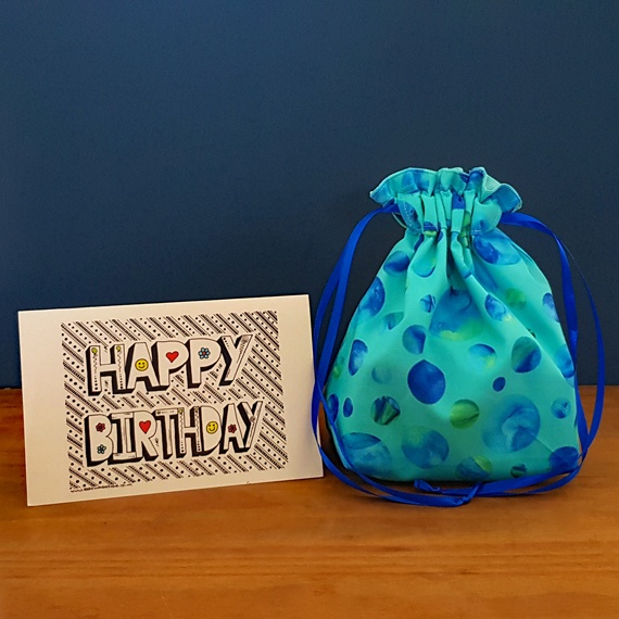 Celebrate sustainably with my vibrant blue batik spots gift bag! This handmade, reusable drawstring pouch is perfect for birthdays, special occasions, or eco-conscious gifting.