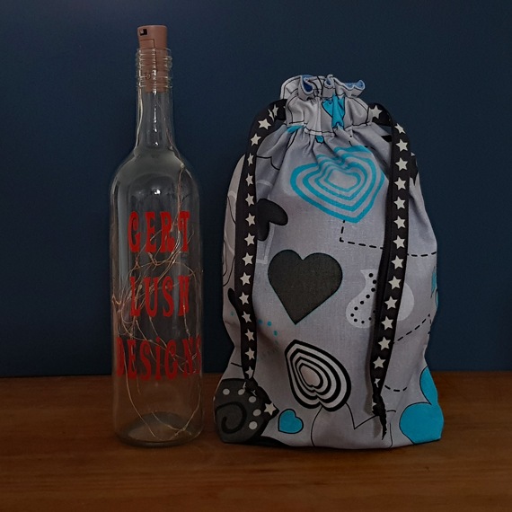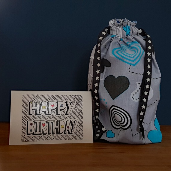 Make gifting more thoughtful and sustainable with this stylish heart-themed fabric gift bag. Reusable, washable, and handmade with a bold mix of greys, blacks, and blues.
