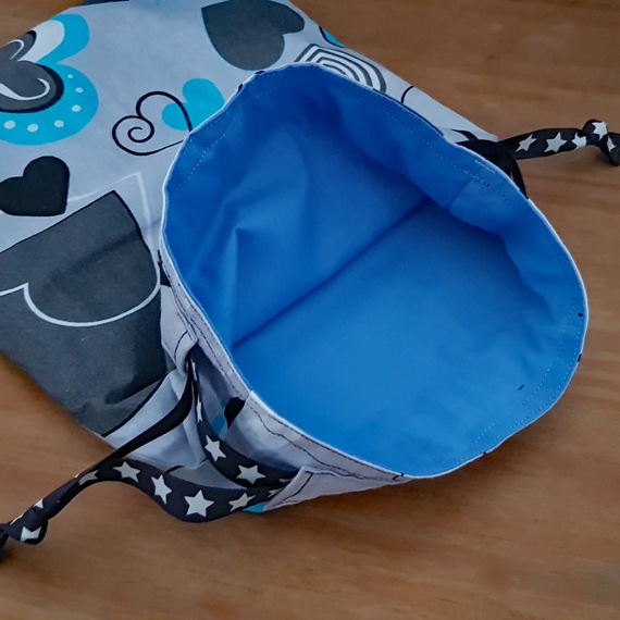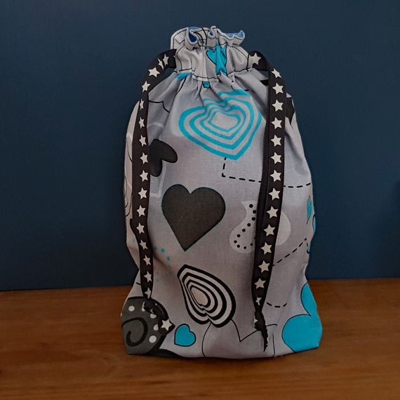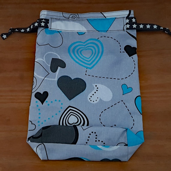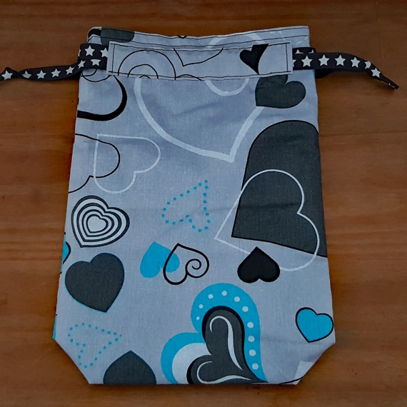 Eco-Friendly Reusable Gift Bag – Handmade Grey, Black & Blue Hearts Drawstring Pouch with Star Ribbon