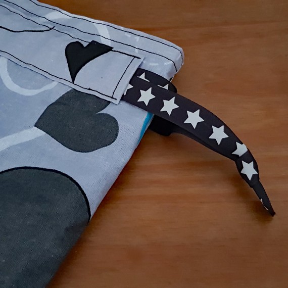 Crafted from durable cotton fabric, this bag features playful and abstract heart motifs on a neutral grey base. The vibrant blue inner lining adds a cheerful surprise, while the standout black-and-white star drawstrings make for a fun, bold finish.