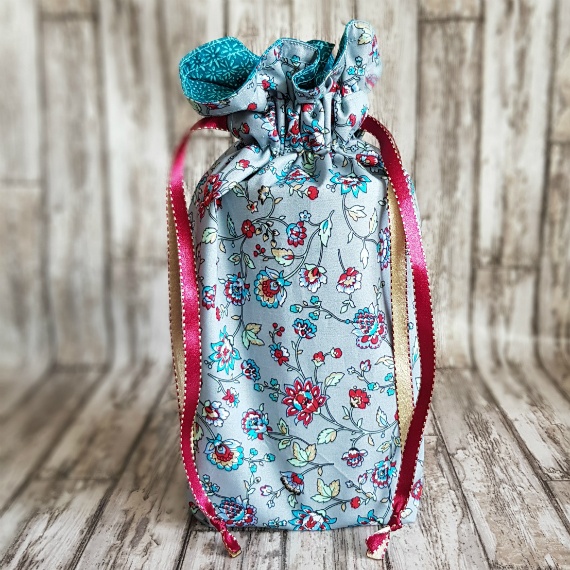Eco-Friendly Reusable Gift Bag – Handmade Swirly Floral Print Drawstring Pouch in Aqua Blue
