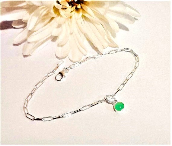 Enhance your look with our Eco silver Mini Rectangle Silver chain bracelet with a cute Chrysoprase 6mm Green Gemstone. This bracelet is designed with sustainability in mind, featuring a stunning Chrysoprase gemstone renowned for its healing properties and vibrant green hue. The silver setting adds an element of elegance, making it a versatile accessory that can be worn alone or layered with other bracelets.