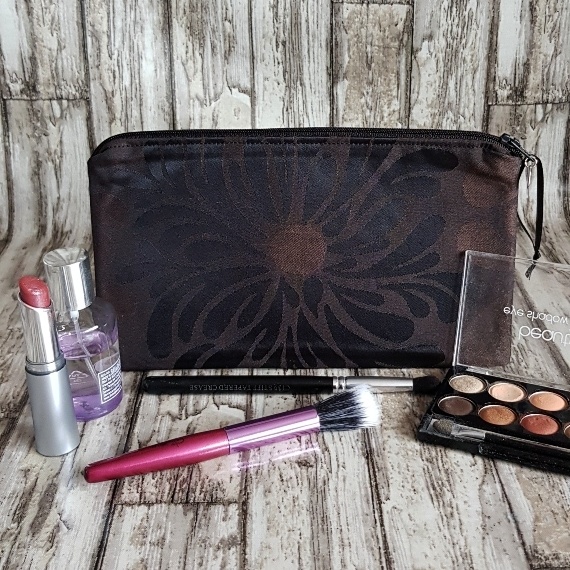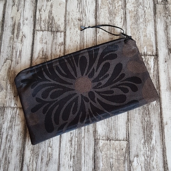 Understated elegance meets everyday functionality in this brown floral zipper pouch. Crafted from a soft, satiny fabric in deep brown tones with an embossed floral design, this medium-sized pouch exudes quiet sophistication. The interior features a smooth brown-toned lining, offering durability and contrast.