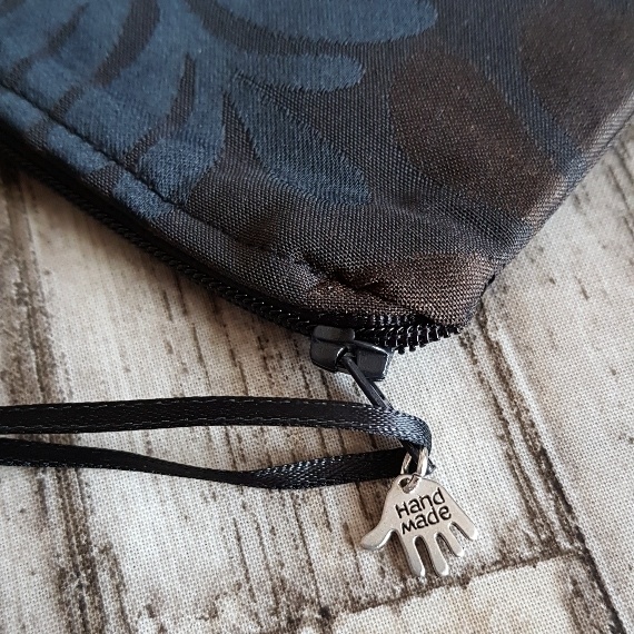 This handmade pouch is perfect for organizing cosmetics, pens and pencils, toiletries, or tech accessories. It features a sleek black zipper, a coordinating black ribbon pull, and a silver “handmade” charm – making it a refined and practical addition to your daily essentials.