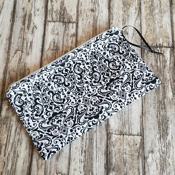 Add a touch of timeless elegance to your essentials with this black-and-white filigree zipper pouch – ideal for makeup, pens, or travel items.