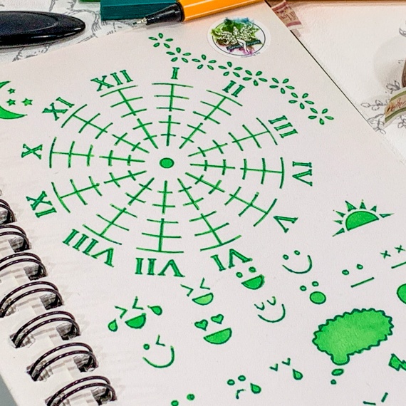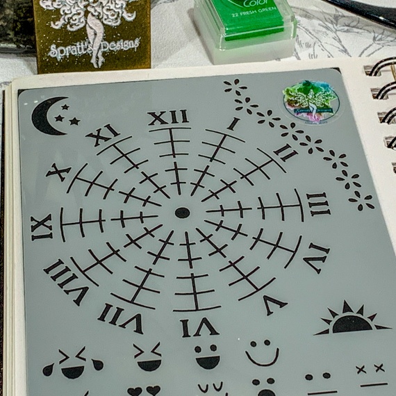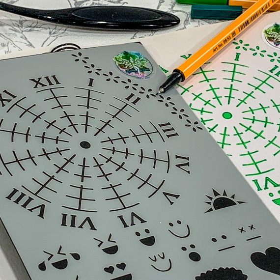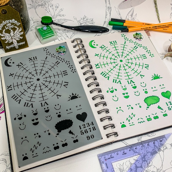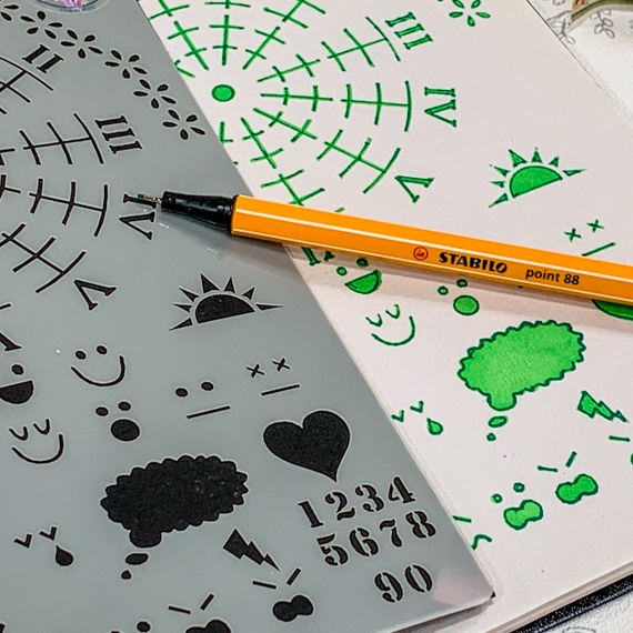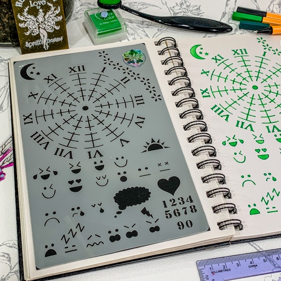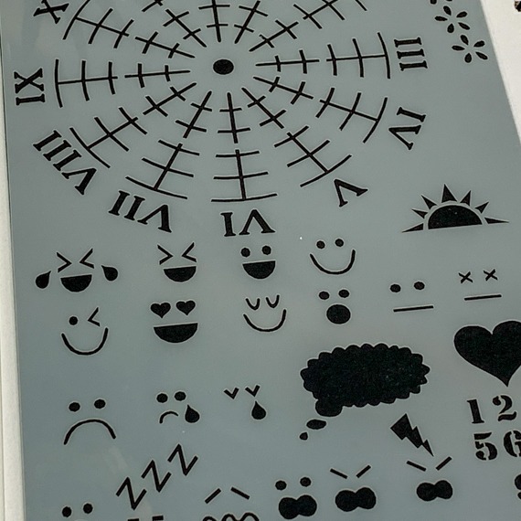 This stencil features a variety of expression emojis, a clock face, thought clouds, love hearts, moon and sun icons, and numbers for comprehensive mood tracking. Explore the detailed close-up photographs to discover more about this innovative tool for mental health support.