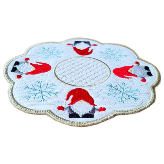 Imagine your dining table adorned with this doily-shaped mat, elegantly featuring cheerful gnomes nestled within delicate frosty snowflakes. All of this is beautifully set against an intricate stippled pattern that adds depth and texture, making it the perfect canvas for your Christmas gatherings. Whether you are hosting an intimate dinner or a raucous Christmas party, this table mat becomes an instant conversation starter, drawing your guests into the heart of your festive celebrations.