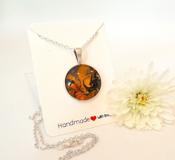 Make a bold and pretty statement with this stunning hand painted, hand made, Fluid Art Pendant Necklace featuring vibrant orange, bronze, and black colors. The 25mm pendant is a unique statement piece that adds a touch of vitality to any outfit.