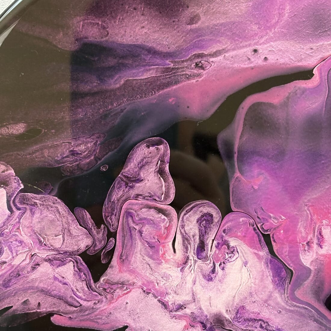 Experience the mesmerizing beauty of this pink fluid art in a Dutch pour technique on a striking black background, enhanced with a glossy resin coating.