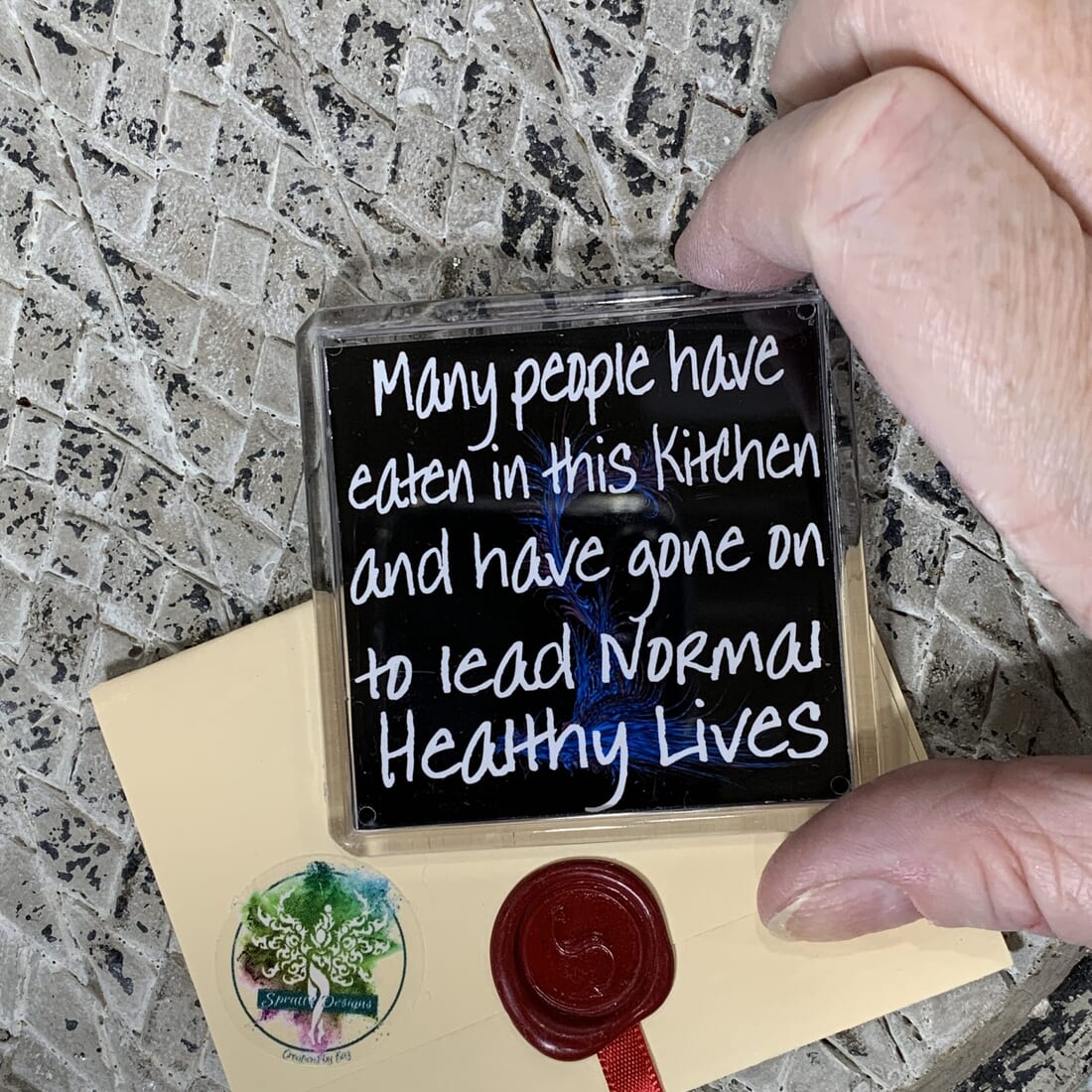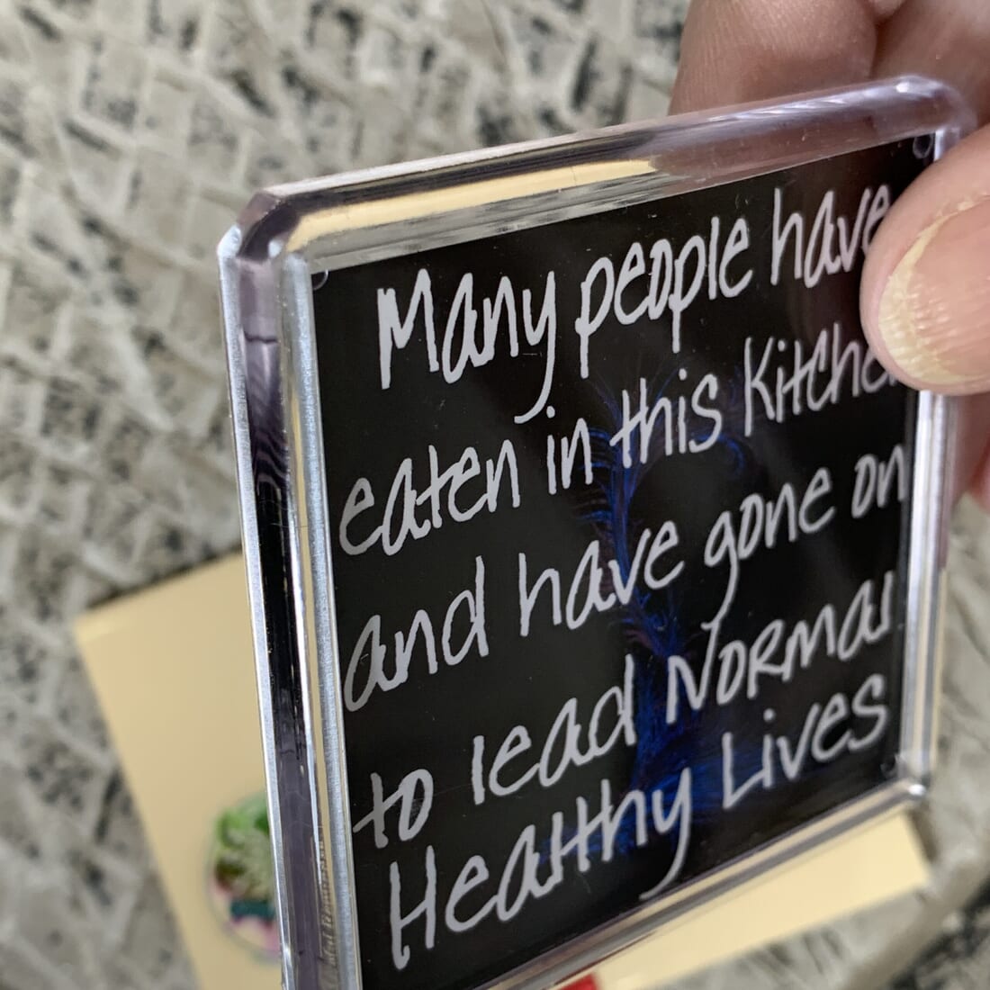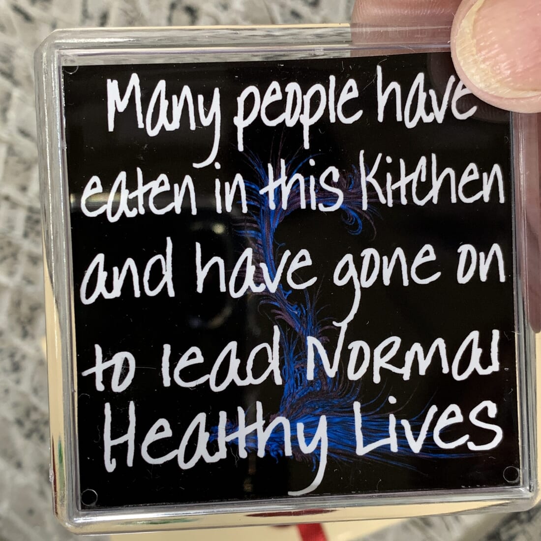 Add a touch of humor to your kitchen with this funny fridge magnet! The magnet features a warning message: ‘Many People have eaten in this kitchen and have gone on to lead normal healthy lives.’ Measuring 6cm x 6cm, this plastic fridge magnet is a quirky addition to your kitchen decor.