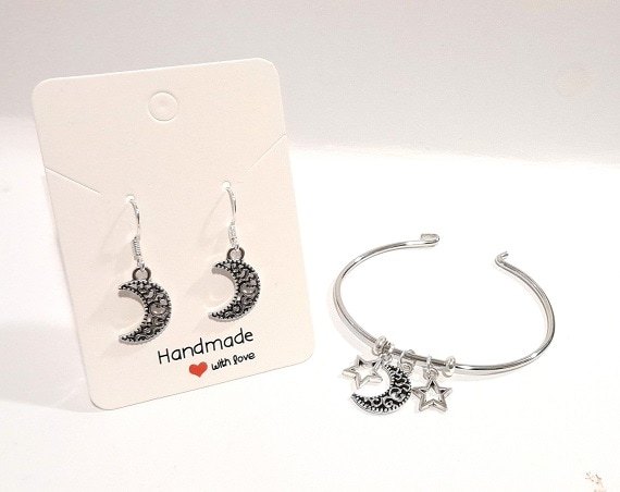 Enhance your style with this stunning Half Moon And stars Rhodium Plated Bangle Set featuring 925 Silver Wires and a 925 silver chain. Perfect for adding a touch of elegance to any outfit.