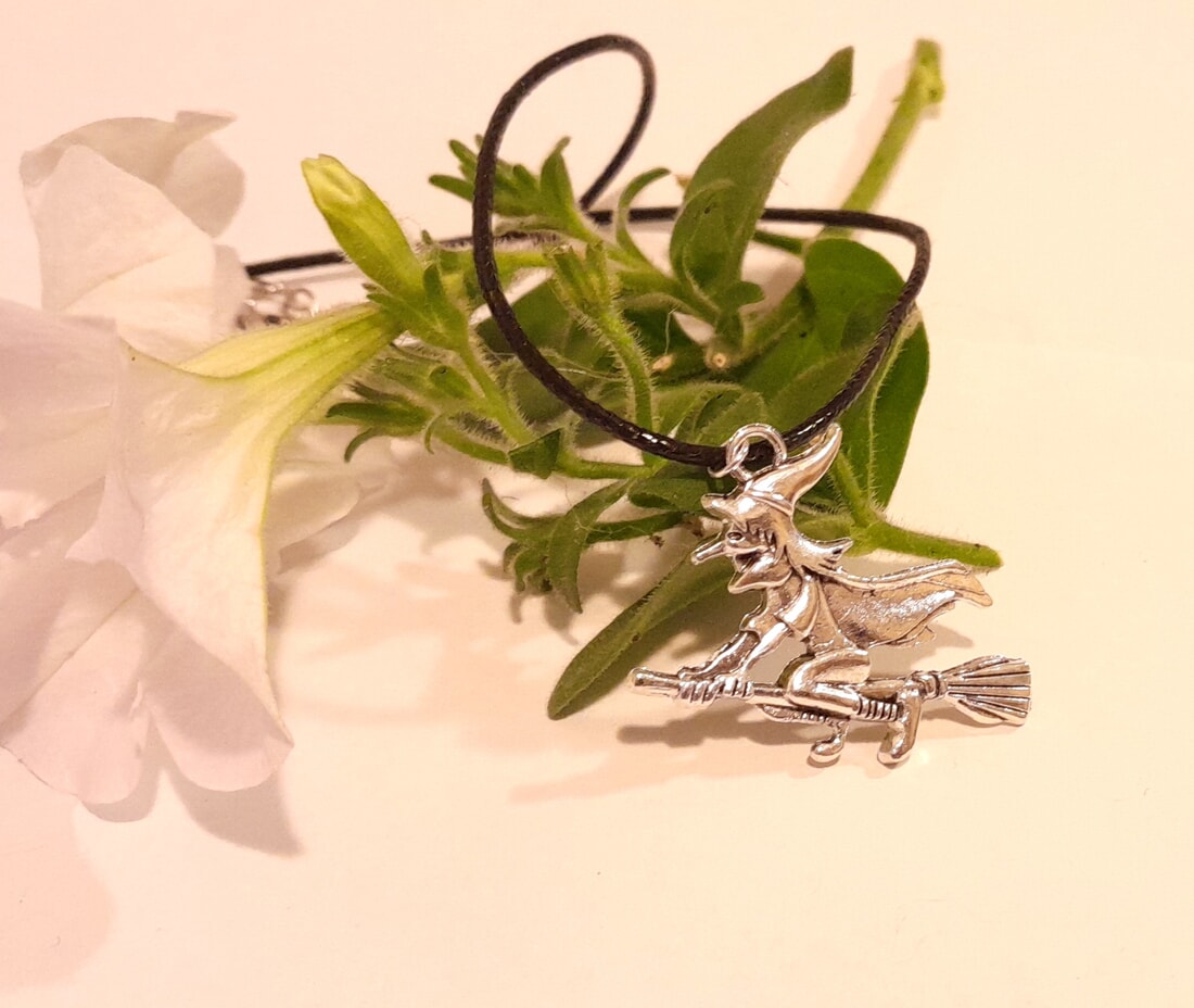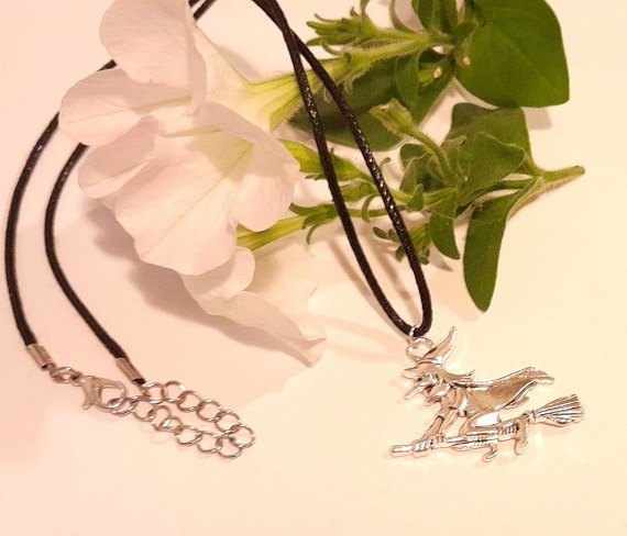 Featuring a silver tone witch on a broomstick, this necklace comes with a black wax cord for a spooky touch.