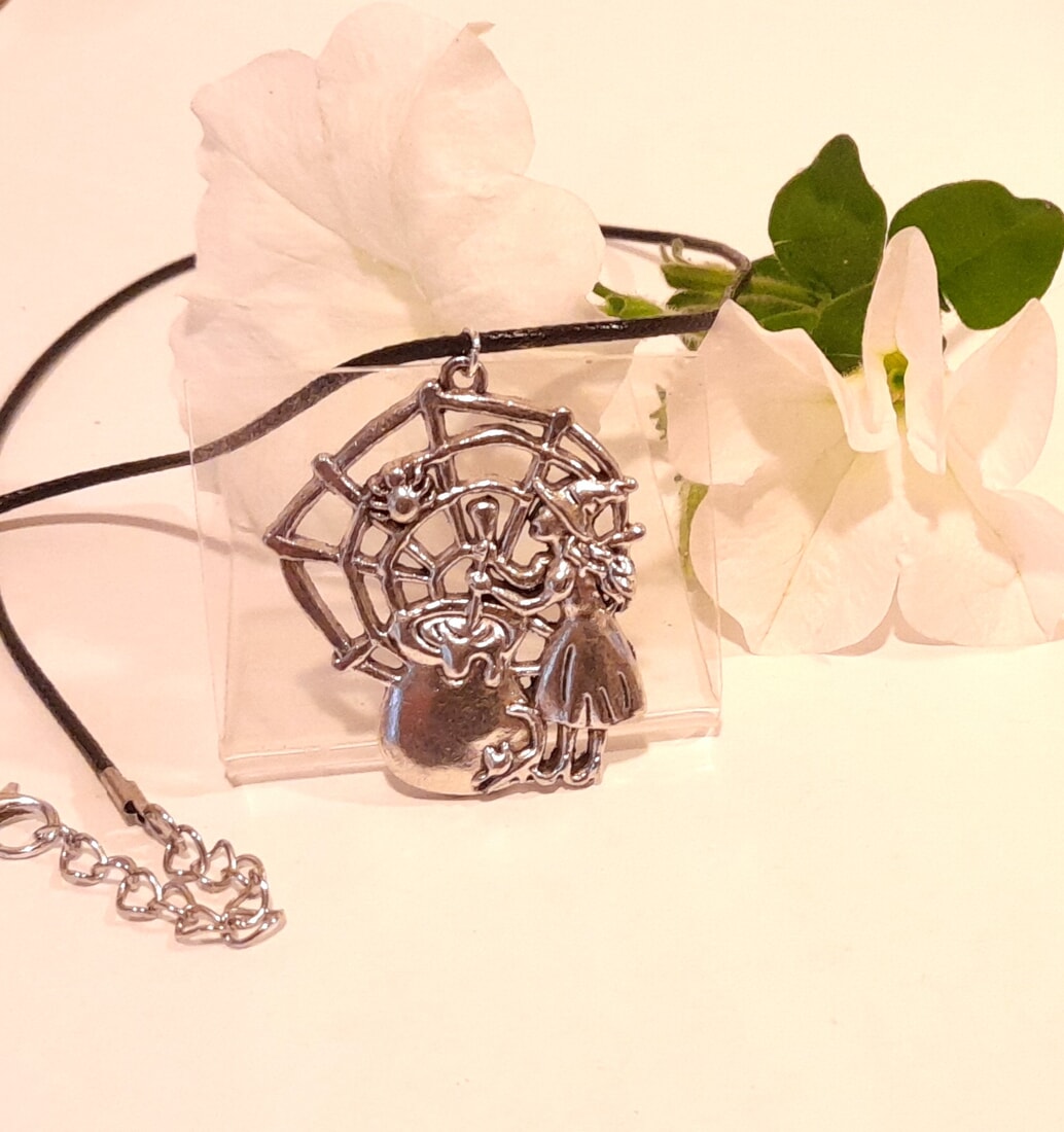 Get into the spooky spirit with this Halloween large pendant featuring a witch stirring a cauldron. The silver tone pendant comes with a stylish black wax cord, perfect for adding a touch of magic to your outfit.