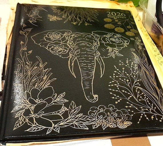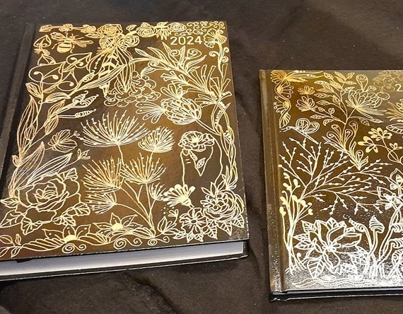 Make a statement with my hand-decorated gold freestyle pattern diary, meticulously designed to add a touch of luxury to your daily routine. Crafted with precision and care, each diary features a unique freestyle pattern created with a gold acrylic paint pen, ensuring that no two diaries are alike.