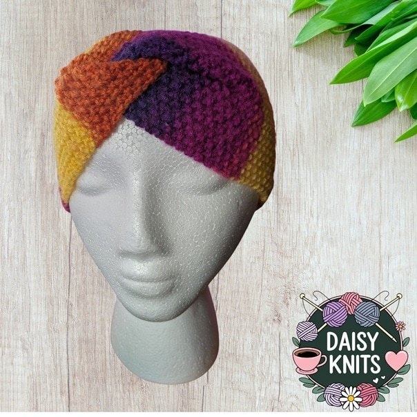 Hand Knitted Ear Warmer in Bright Multi Coloured Yarn