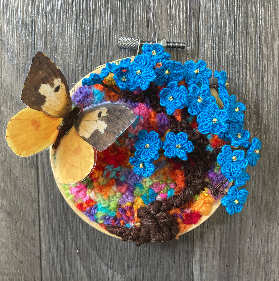 Enhance your home decor with this unique hand-stitched embroidery hoop featuring a textile sculpture tree with blue blossoms. Measuring 10cm round, this piece is intricately crafted using recycled yarn cut-offs, creating a colorful and eco-friendly background.