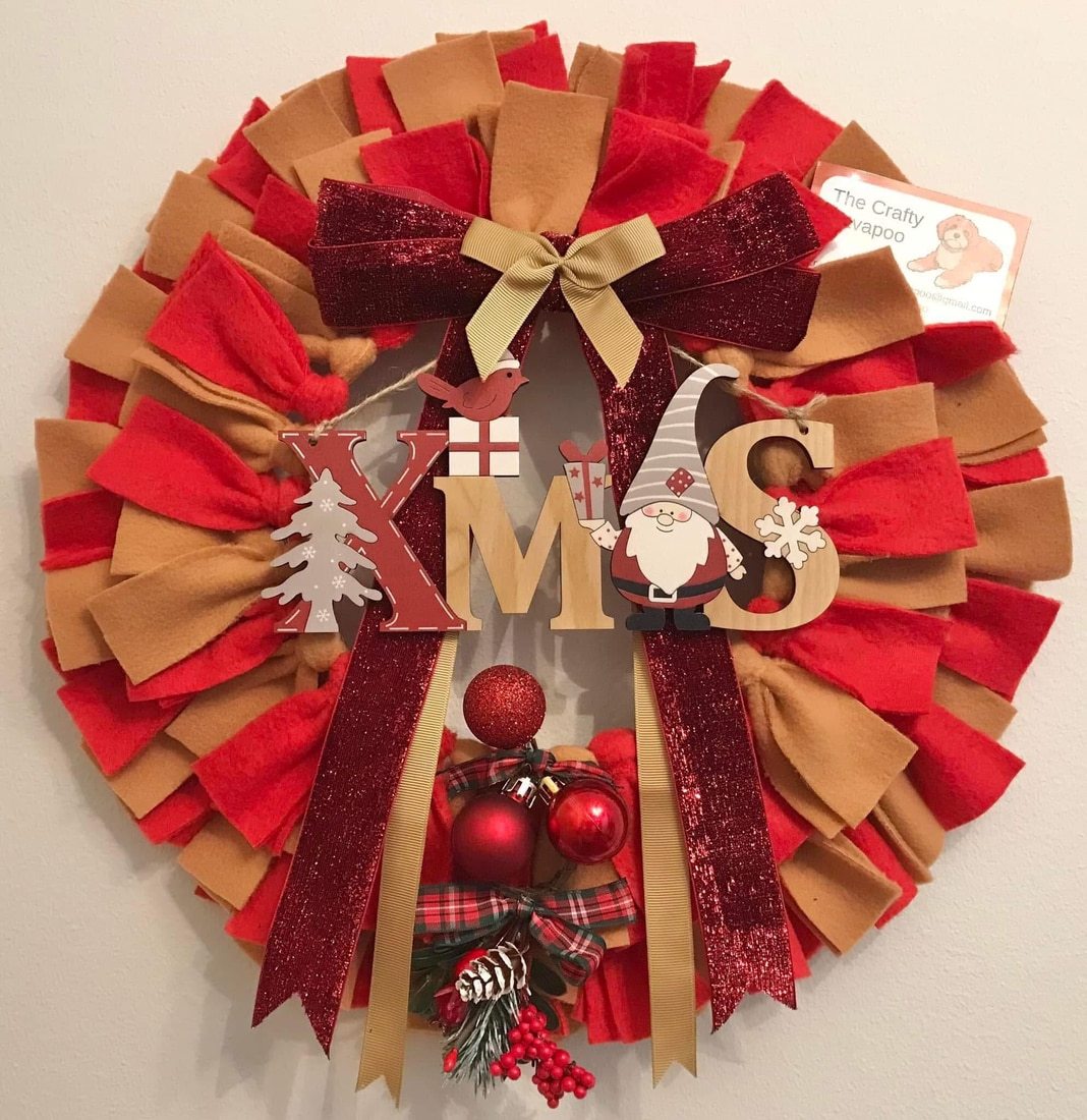 The wreath has been meticulously handcrafted with individually cut and tied polar fleece fabric strips on a metal frame, and adorned with a large bow, baubles, a garland and a wooden ‘Xmas’ sign!