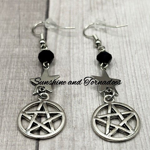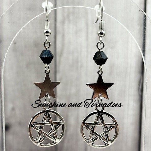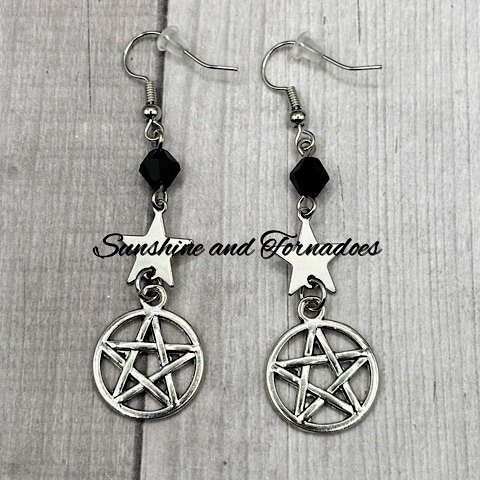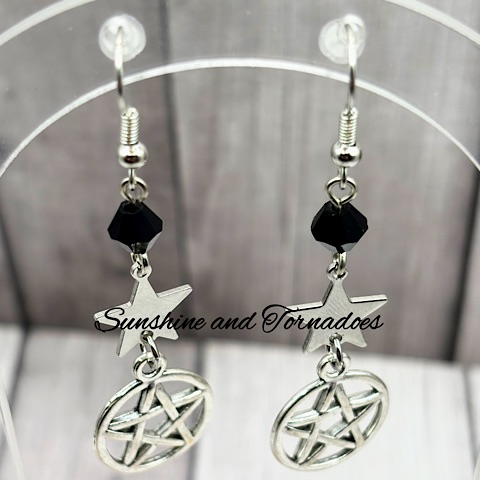 Handmade Drop Earrings. Silver Plated Pentagram/Pentacle charms with Black Czech Glass Bicone Beads and Stainless Steel Stars. Hypoallergenic ear wires. Handmade in the UK by Sunshine and Tornadoes, the home of fun and funky handmade Jewellery.