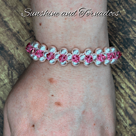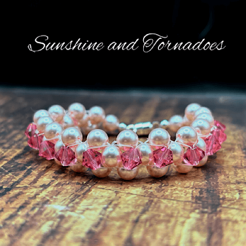 Handcrafted Right Angle Weave Pearl Bead Bracelet. Embellished with Czech Glass Bicone Beads and finished with a Silver Plated magnetic Barrel Clasp. Fits wrists of around 6 inches (15cm). Handmade in the UK by Sunshine and Tornadoes – Beadwork Jewellery and Accessories.