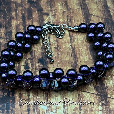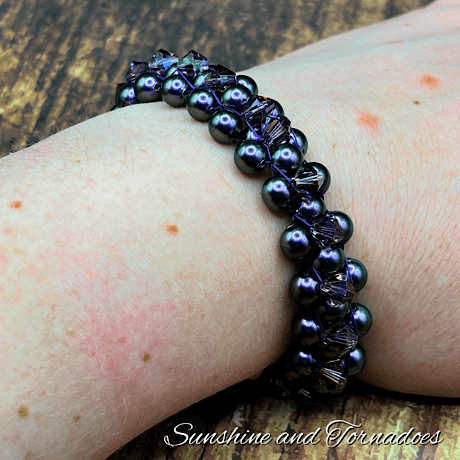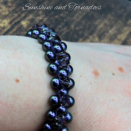 Handcrafted Right Angle Weave Pearl Bead Bracelet. Embellished with Czech Glass Bicone Beads and finished with a Stainless Steel Lobster Clasp. Fits wrists of around 6 inches (15cm). Handmade in the UK by Sunshine and Tornadoes – Beadwork Jewellery and Accessories.