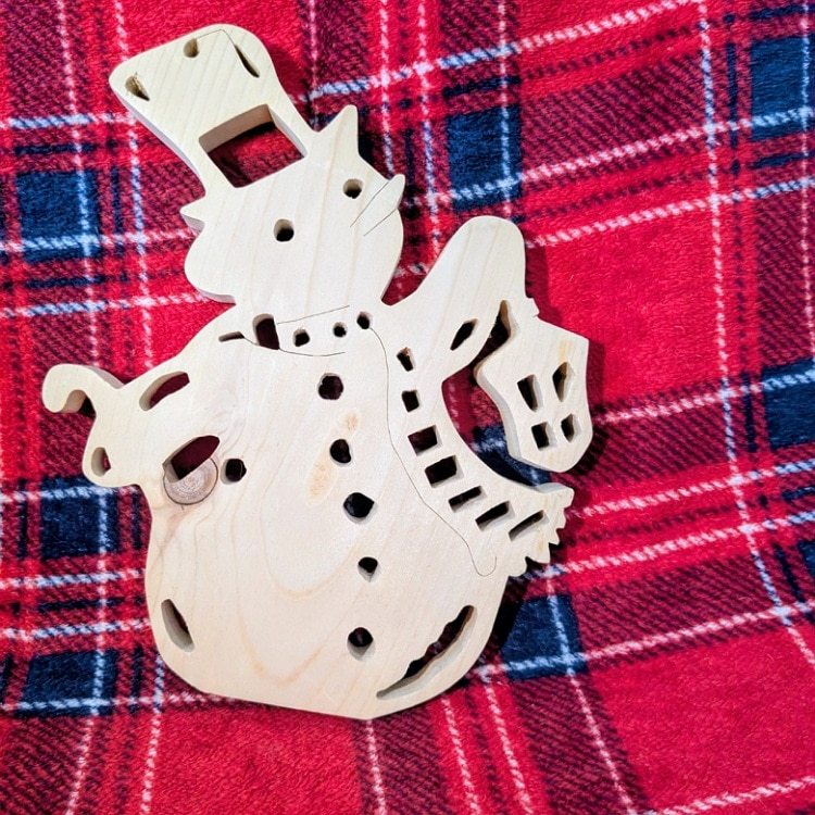 Add a charming touch to your holiday decor with this handcut pine snowman decoration. Measuring 19 x 23 x 2 cm, this one-of-a-kind piece is perfect for spreading festive cheer. Limited availability, so grab yours now!