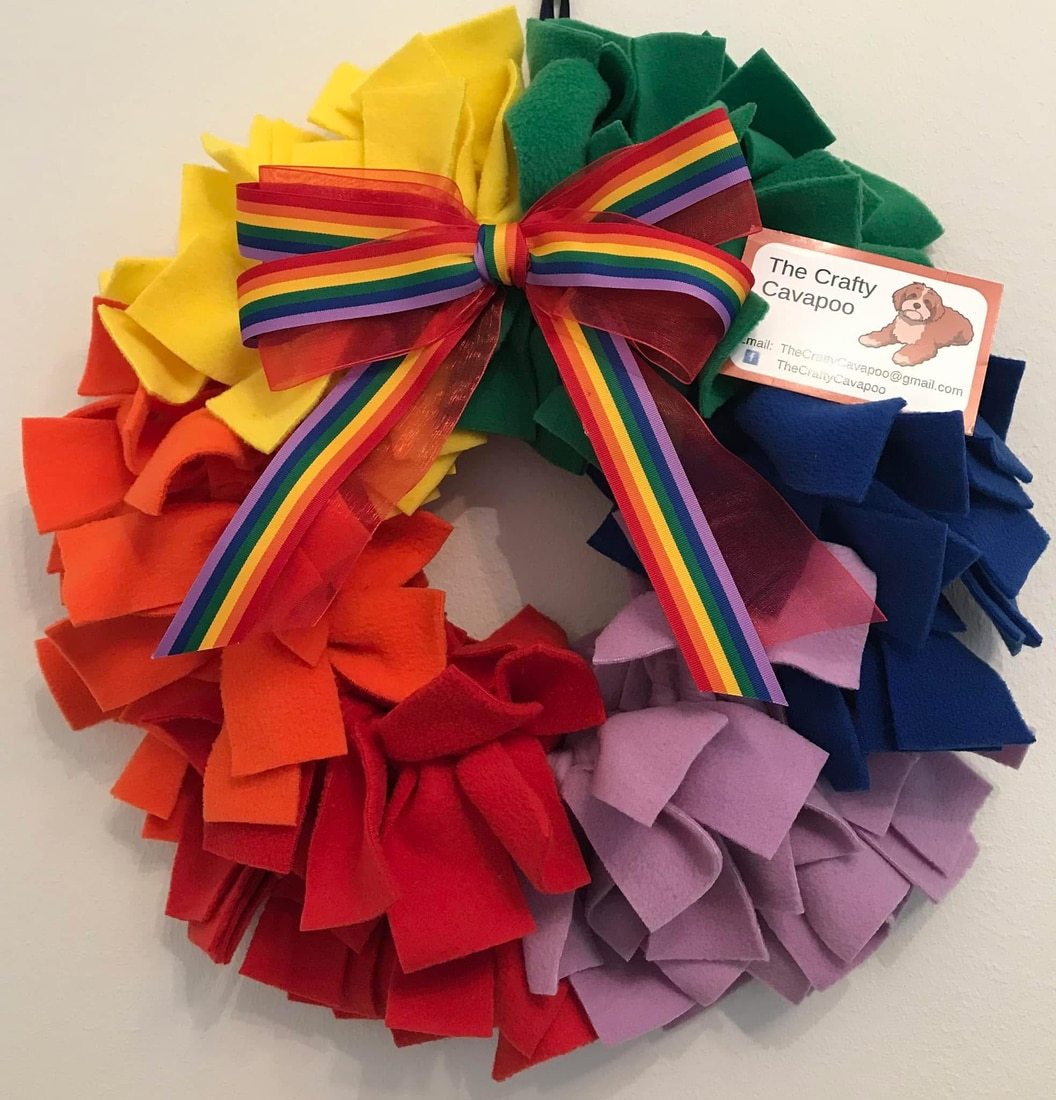 The wreath has been meticulously handcrafted with individually cut and tied polar fleece fabric strips on a metal frame, and adorned with a colourful bow.