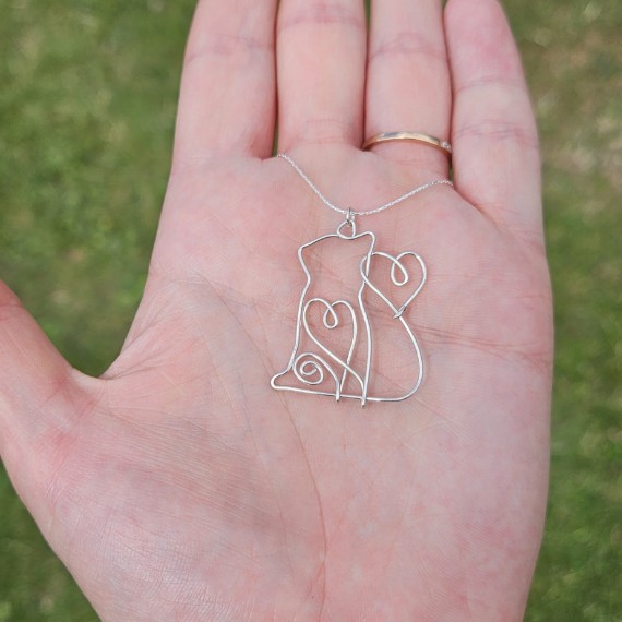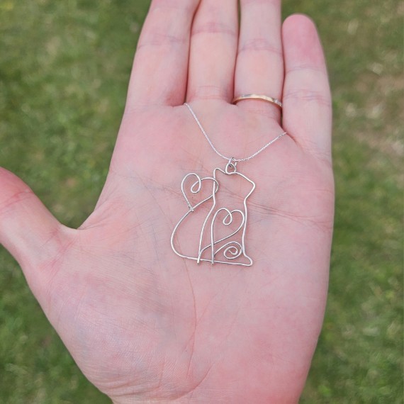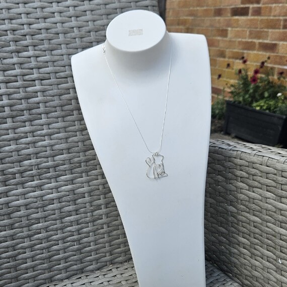 Adorn yourself with this exquisite handcrafted silver cat pendant necklace featuring a charming flowing heart design. Made from 0.8mm, 925 sterling silver wire, this unique necklace comes with an 18-inch sterling silver chain, making it a perfect accessory for any cat lover.