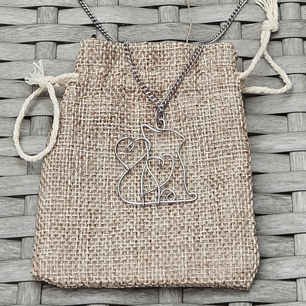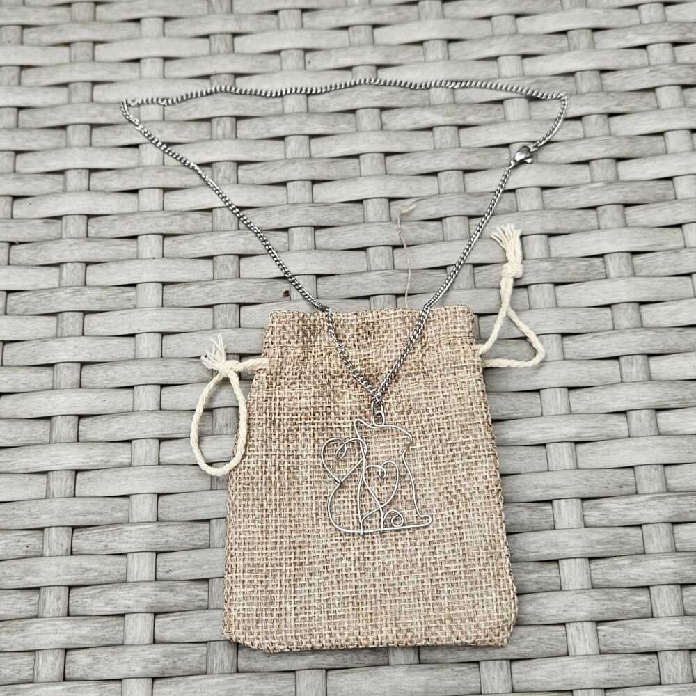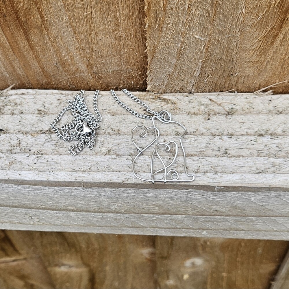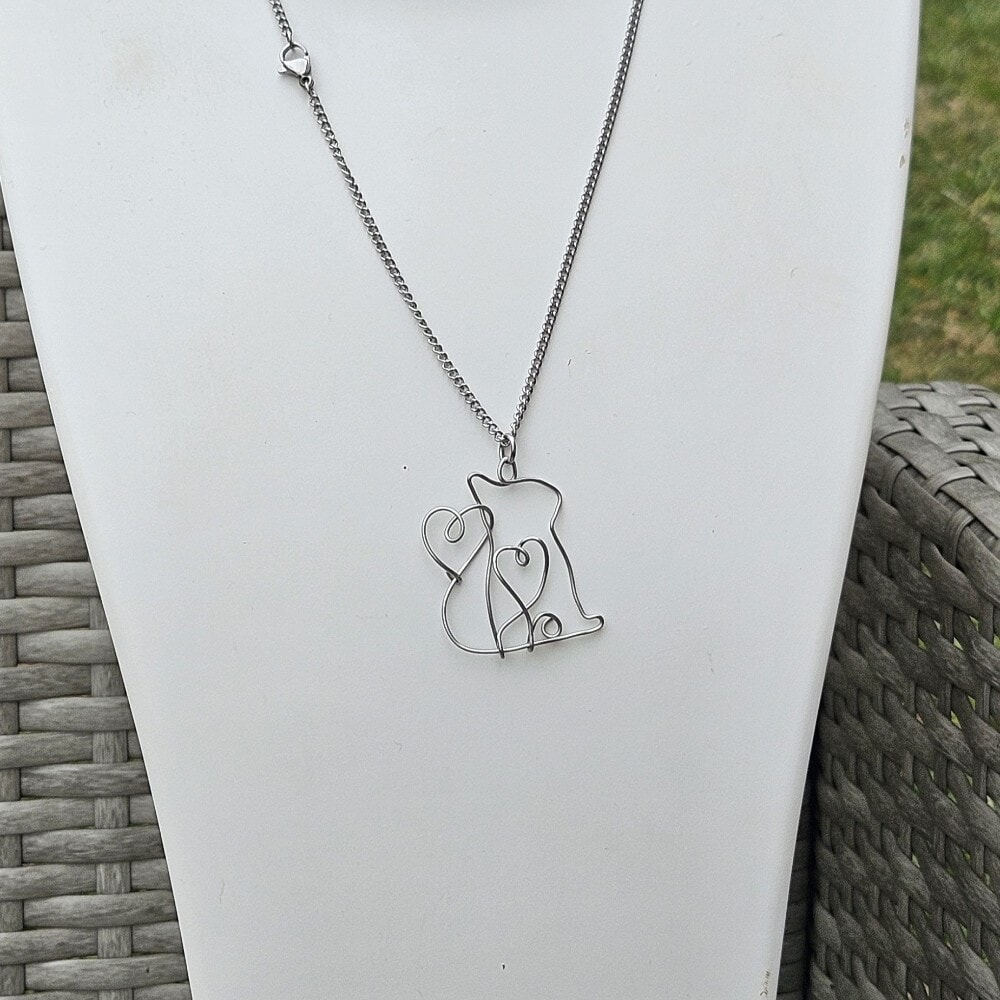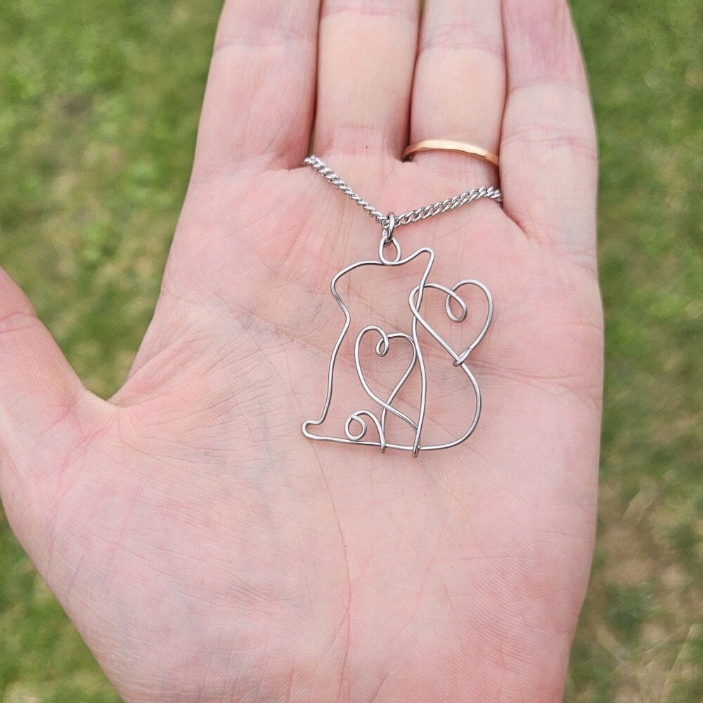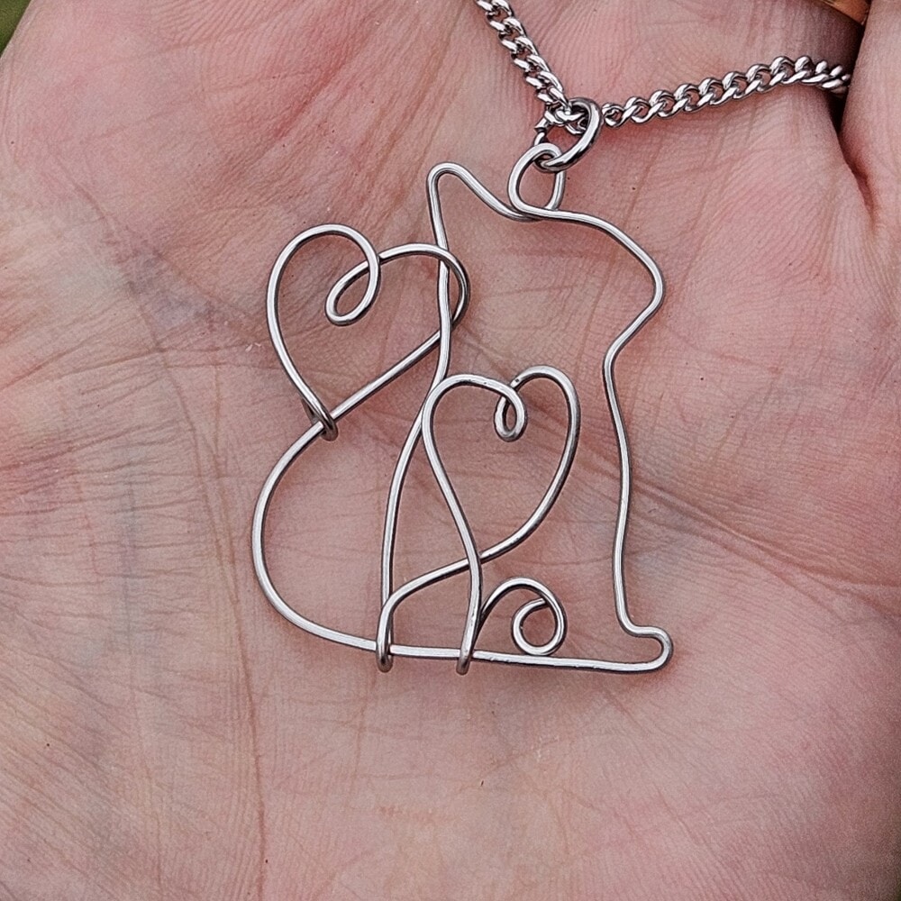 Adorn yourself with this exquisite handcrafted Stainless steel cat pendant necklace featuring a charming flowing heart design. Made from 0.8mm, 314 grade stainless steel wire, this unique necklace comes with an 18-inch 304 grade stainless steel chain, making it a perfect accessory for any cat lover.